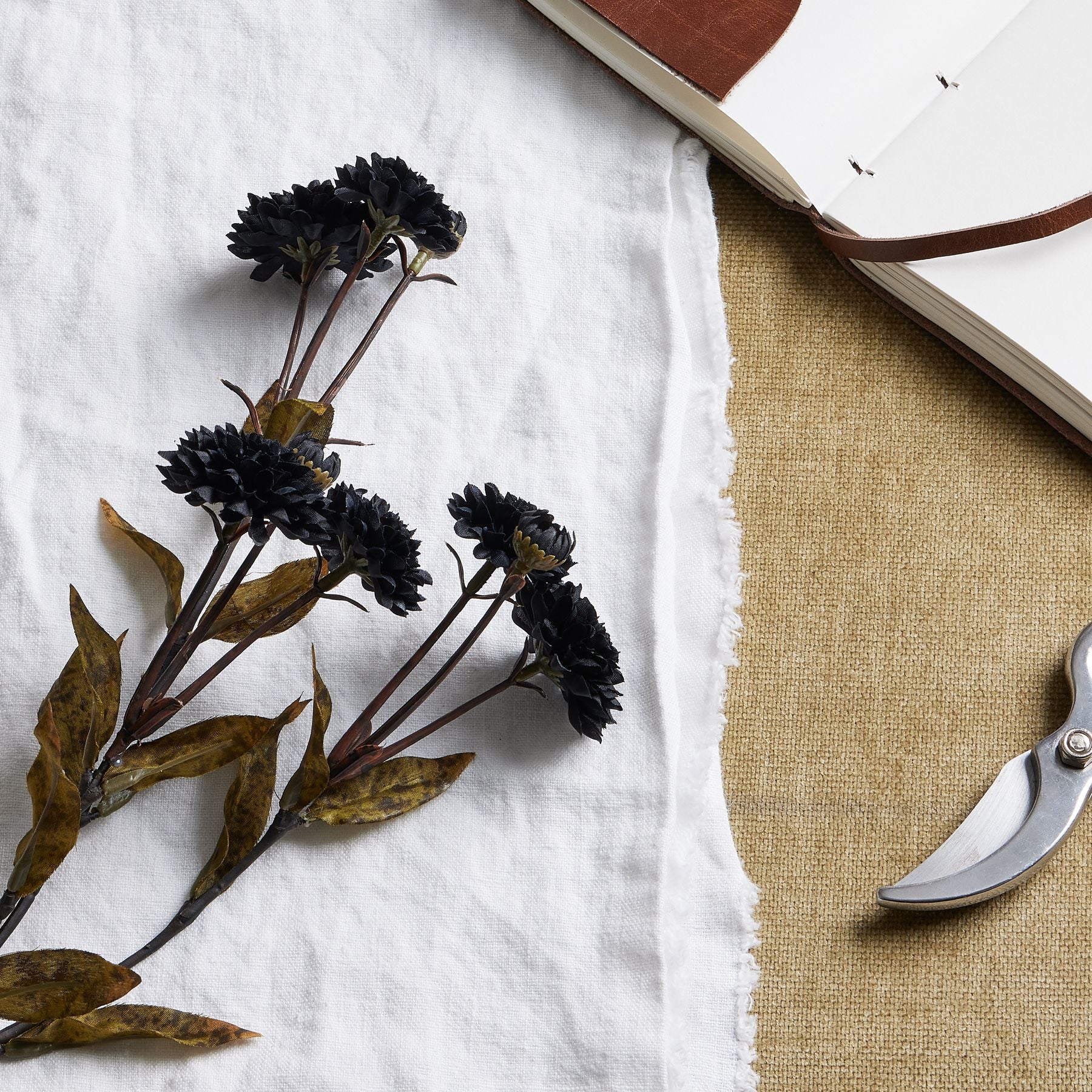 For cohesive storytelling, pair this artificial bloom with our tall black poppy stems and blackened grass sprays to create a monochrome display, or introduce contrast with pale pink tea rose or cream cosmos spray to achieve an elegant light-and-dark interplay. The silver wattle leaf and ornamental burgundy leaf accessories provide a refined foliage backdrop, emphasizing the chrysanthemum's coloring and adding textural variety to the composition. Ideal for boutique florists, high-end retail displays, and interior designers seeking unexpected, sophisticated elements in botanical arrangements.