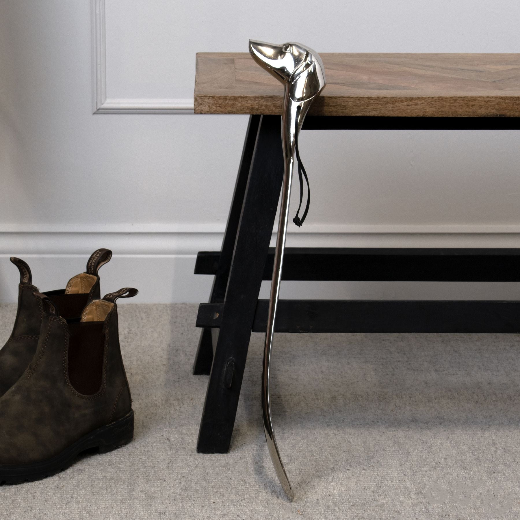 Masterfully crafted in silver nickel, this refined shoe horn presents a distinctive canine head detail that marries practicality with luxurious aesthetics. The polished surface catches light, lending an air of refinement to any entryway or dressing space. Part of an exclusive collection of distinctive accessories, it harmonizes with companion designs featuring equestrian and stag motifs, inviting collectors to build a cohesive display of direction and taste. The long-handled profile ensures comfortable use while preserving an understated grace that speaks to discerning customers.